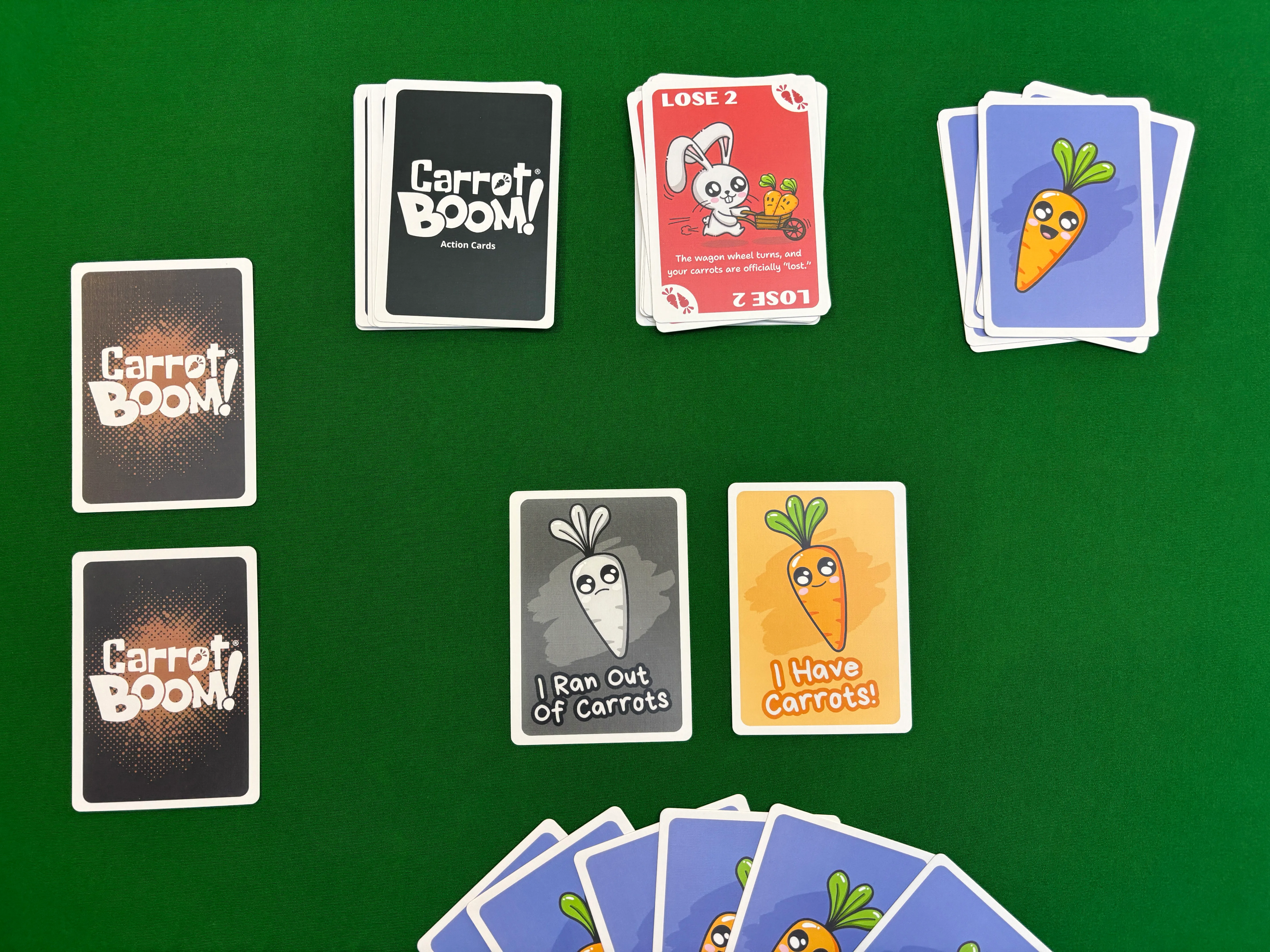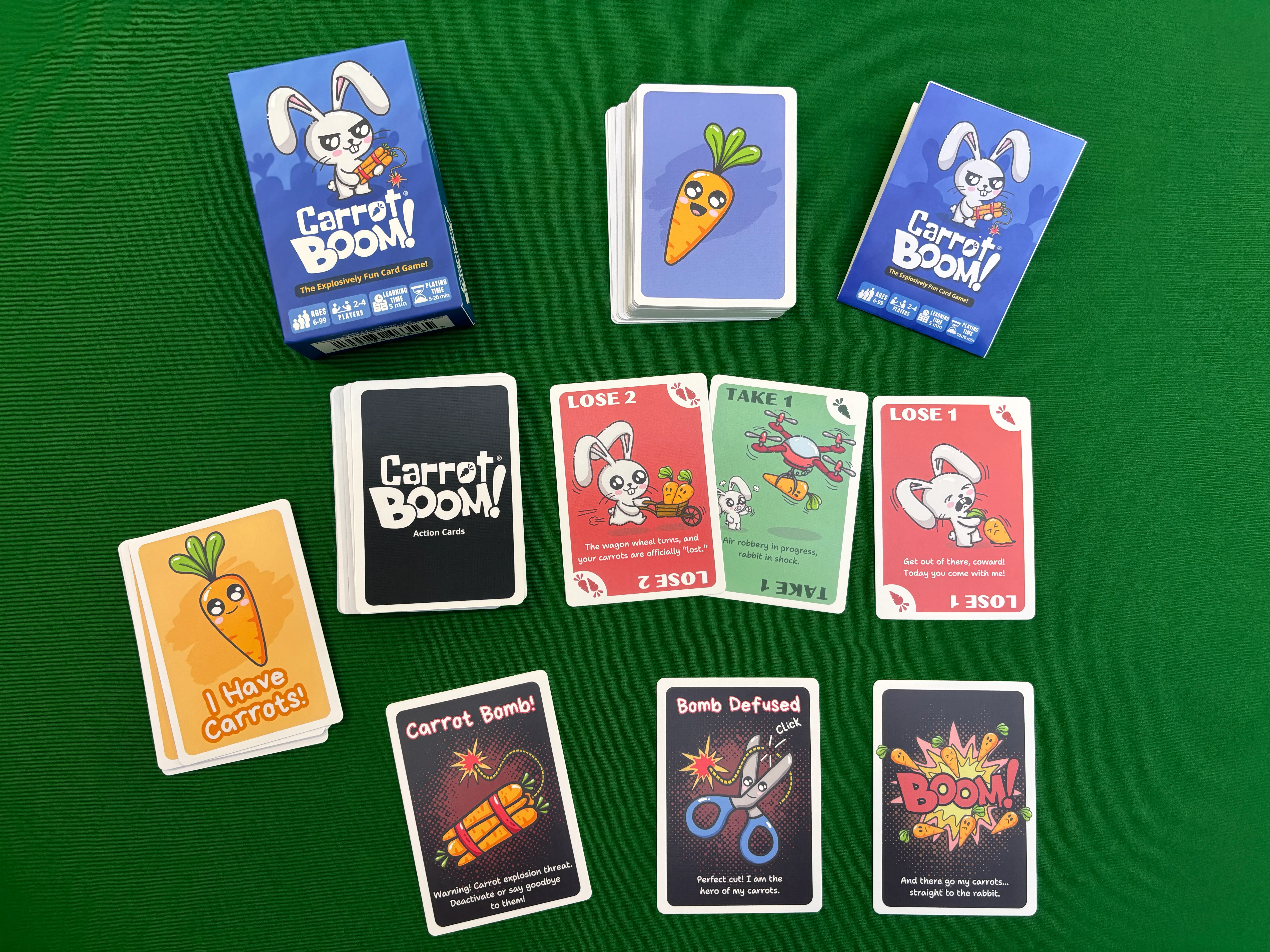 Step into the fast-paced frenzy of Carrot Boom!, the explosively fun card game where players of all ages compete to collect the most carrots while navigating unexpected twists! Also, beware of the mischievous rabbit wanting to take away all of your carrots!